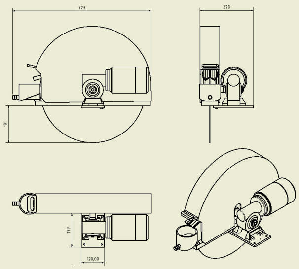 Polžni reduktor z asinhronskim elektromotorjem iz aluminijskega ohišja firme SIEMENS. Mehanska zaščita motorjev IP 44 po predpisih IEC 34-5/1968.