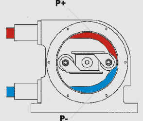 | Pritisni mehanizem je izdelan tako da je pritisk porazdeljen preko centra pogonske gredi na dva dela, zato ni prisotnih izrazitih impulznih pretokov kateri se pojavljajo pri batnih, excentričnih in membranskih črpalkah. Delovanje je izrazito mirno ker črpalko poganja polžni reduktor. Zaradi izvedbe je črpalka primerna za doziranje in hkratno kontrolo pretoka. |