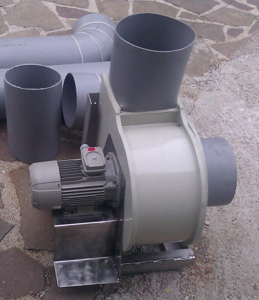 Popolnoma plastična izvedba centrifugalnega radialnega ventilatorja izdelanega iz polipropilena zaradi odličnih mehanskih temperaturnijh in proti kemičnim uplivom odpornih lastnosti. Sama konstrukcija je izdelana iz kislinsko odpornega nerjavečega jekla kvalitete W.Nr. 1.4571 s prigrajenim asinhronskim elektromotorjem. Vsi deli ki pridejo v stik z fluidom so izdelani iz polipropilena.