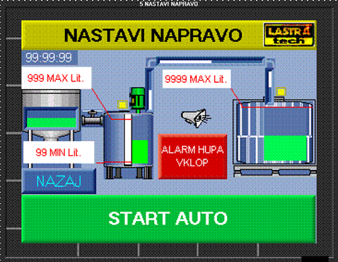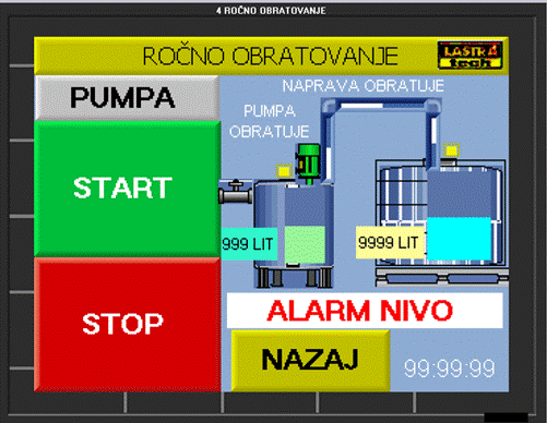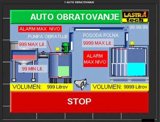 ![]() AVTO OBRATOVANJE meni aktivira pred nastavljene parametre in omogoča popolnoma nadzorovan , večnivojsko varovan in trenutno odziven dozirni sistem na način da aktivira črpalko ob dovolj visokem nivoju hkrati nadzoruje nivo v IBC kontejnerju in izklaplja črpalko ko tekočine v posodi ni več ali pa je nivo v IBC dosežen. Sistem prikazuje trenutno litražo v posodah.Dinamično se prikazuje delovanja cevovoda , stanja črpalke, nivojev v posodah ter trenutni čas. STOP ustavi prečrpavanje in avtomatski nadzor ter vrne v meni OBRATOVANJE NAPRAVA .
