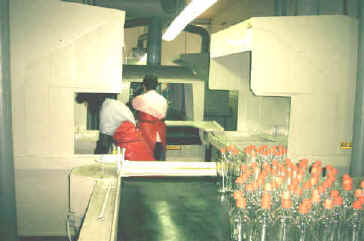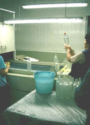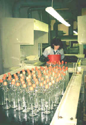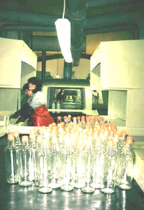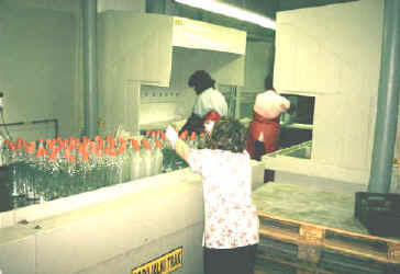 prikaz polnjenja linije - začetna delovna pot pred SATINIRANJEM oziroma dekoracijskem jedkanjem površine steklenih izdelkov