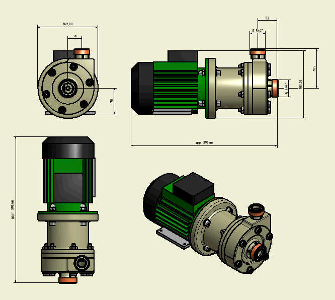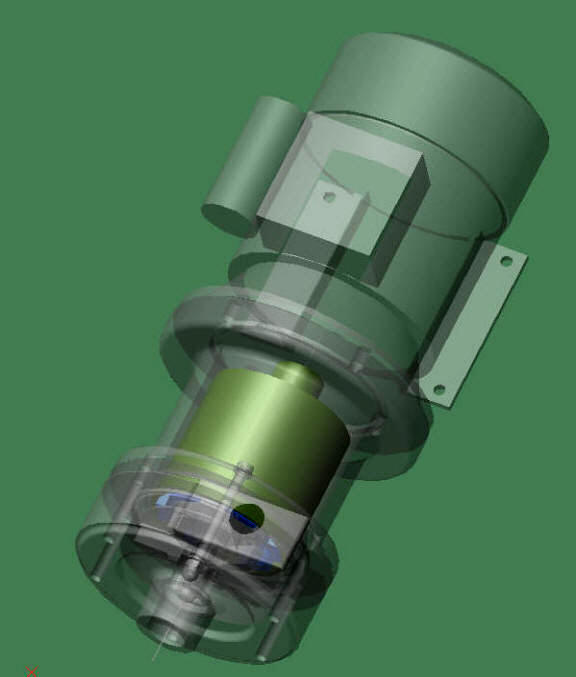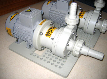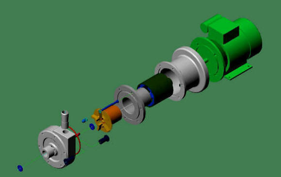 ,3x400V, 50Hz MAGNETNA SKLOPKA Rotor črpalke je pritrjen na magnetno jedro.Magnetno jedro z rotorjem je keramični ležajeno in teče v ločeni komori katera služi še kot nosliec za keramični ležaj . Na elektromotor je nasajen valjasti okvir s pritrjenimi visoko zmoglivimi permanentnimi magneti ki ustvarijo magnetni zaključen krog in preko magnetnega momenta poganjajo jedro z rotorjem v ločeni komori. Tako je tekočina (KISLINA) popolnoma ločena od pogonske gredi elektromotorja in preprečuje kakršno koli uhajanje nevarne snovi v okolje. Magnetni momenti so tako veliki da se lahko poganja črpalke tudi z močmi nekaj kilovatov. Vsi elenemti ki pridejo v stik s tekočino so plastični in keramični. Serijsko izdelujemo črpalke vse do moči 4kw in maksimalnega pretoka 30m3/h.