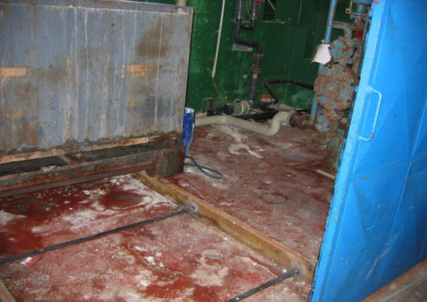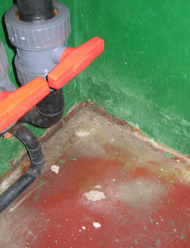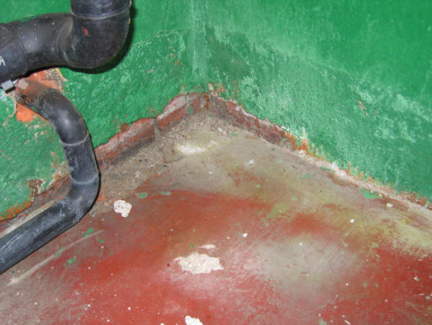 | Če se v geometriji tal v prostoru nahajajo področja da tekočina ostaja na mestih pri vogalih ali okoli kinet so te razjede še posebno intenzivne. Na tistih mestih je vedno prisotna večja količina ali koncentracija medija Kjer pa se nahajajo alkalije se tvorijo soli v razpokah in poslabšujejo oprijem novega sloja epoxi premaza. |