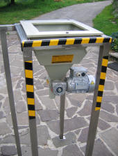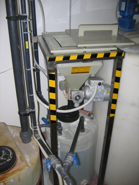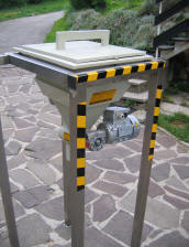 | .SPLOŠNONaprava je namenjena dozirnaju barijevega karbobnata , kalcijevega hidroksida,sode bikarbone .....v pripravno kopel. Vsebine se strese v odprtino , se pokrije z pokrovom in ob vključitvi polžni transporter z pomočjo vibratorja potiska vsebino v pripravljalno kopel. Za optimalno delo je polž krmiljen z frekvenčnim regulatorjem in sistemom avtomatskega in ročnega režima.Avtomatski režim je obratovanje polža preko časovnega releja v razmerju 1:1 in možnostjo nastavljanja hitrosti doziranja,Ročni režim pa je neprekinjeno obratovanje polža s tem da mu ravno tako lahko prilagajamo hitrost.