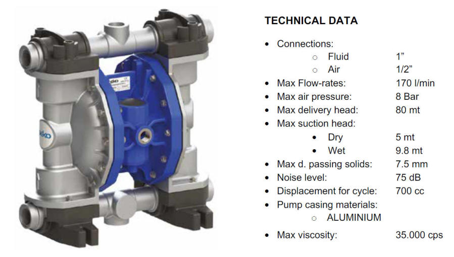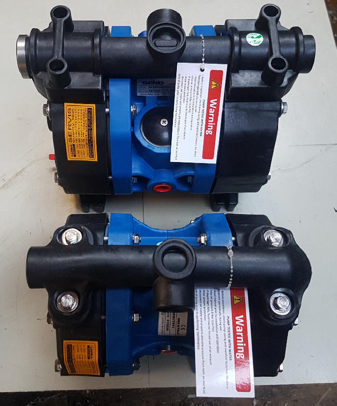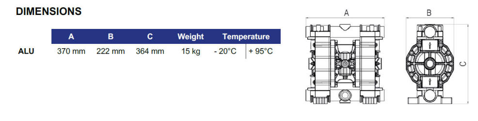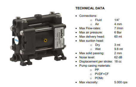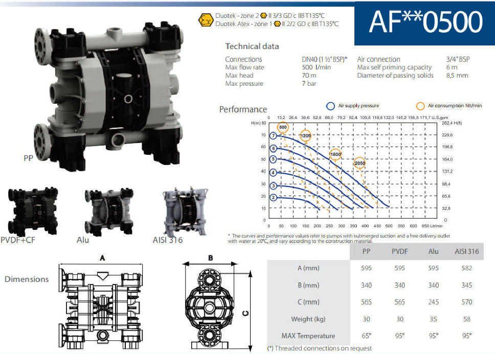 Pnevmatska črpalka Duotek, 50 l/min, PP+PTFE, 1/2" BSP POLIPROPILEN IZVEDBA V KOMBINACIJI Z TEFLON MEMBRANANMI IN