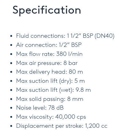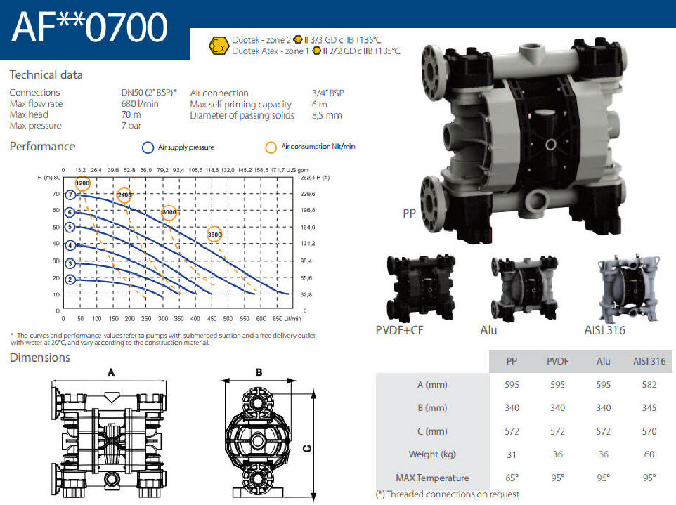 Pnevmatska črpalka Duotek, 70 l/min, PP+HYTREL+PTFE+FPM, 1/2" BSP