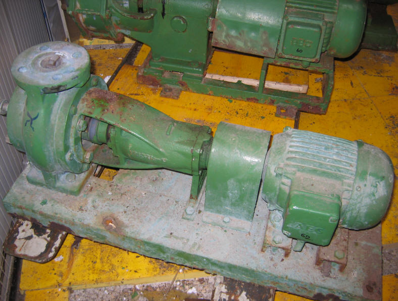| IME RABLJENE OPREME št 4 | RABLJENE CENTRIFUGALNE ČRPALKE KSB | FOTO | | | |  | | PROIZVAJALEC | KSB A.G. | | LETO | 1989 | | OPIS OPREME | CENTRIFUGALNA ČRPALKA KSB ? pretoka ? CCA 100 L/MINTLAK? CCA 1BAR motor: AEG 3X400V .55kW z sklopko na plošči Črpalka je v dobrem stanju ohišje je jekleno gumirano na plastičnem podestu Črpalka je delovala v nemčiji nekaj let z namenom prekrpavanja kemične raztopine | | POREKLO | NEMČIJA | | STANJE OPREME | *** | | CENA: | 150 EUR |